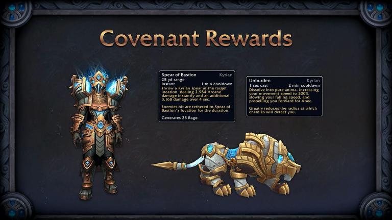 Teremos também os 4 Pactos (Kyrianos, Venthyr, Feérios Noturnos e Necrolordes) que funcionarão mais ou menos como o sistema de reputação porém o jogador só poderá escolher um. Caso se arrependa e queira trocar para outro terá que desfazer a aliança com o atual e conquistar a confiança do novo Pacto.