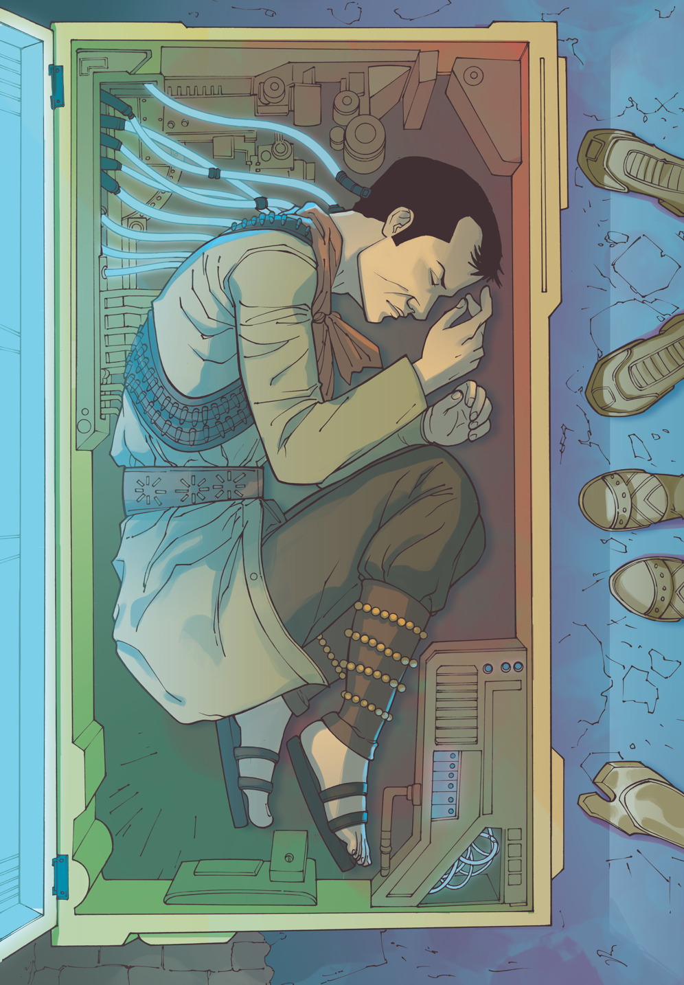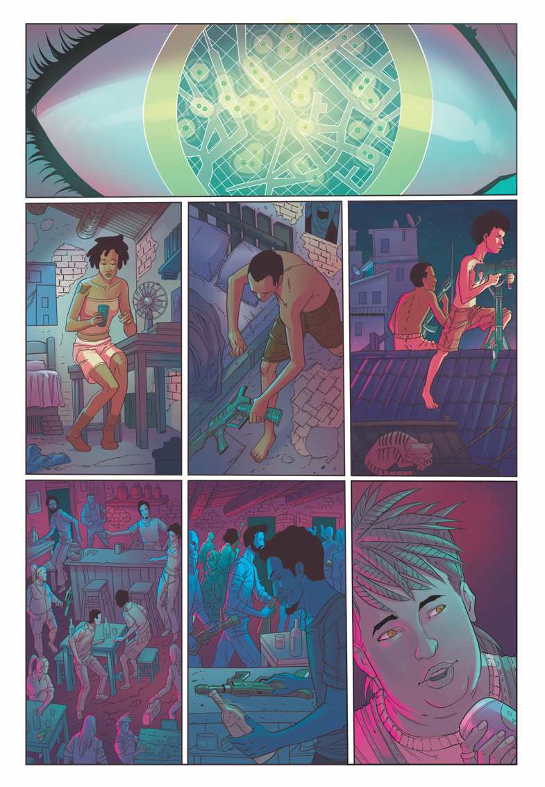 Acho que foi no final de 2015, com um edital de cultura abrindo no Governo do Estado do Ceará, que perturbei o Geovani para fazermos algo juntos. Ele foi logo dizendo que “poderia ser aquele projeto com cangaceiro que conversamos”. Ao cavucar minhas anotações procurando algo já iniciado, encontrei Cangaço Overdrive e decidi usar o plot principal. Mas, para aproveitar melhor o estilo de desenho do Geovani, não dava para ser tira e nem cômico. E assim o projeto começou se tornar um legítimo cyberpunk, com todos os seus pessimismos.